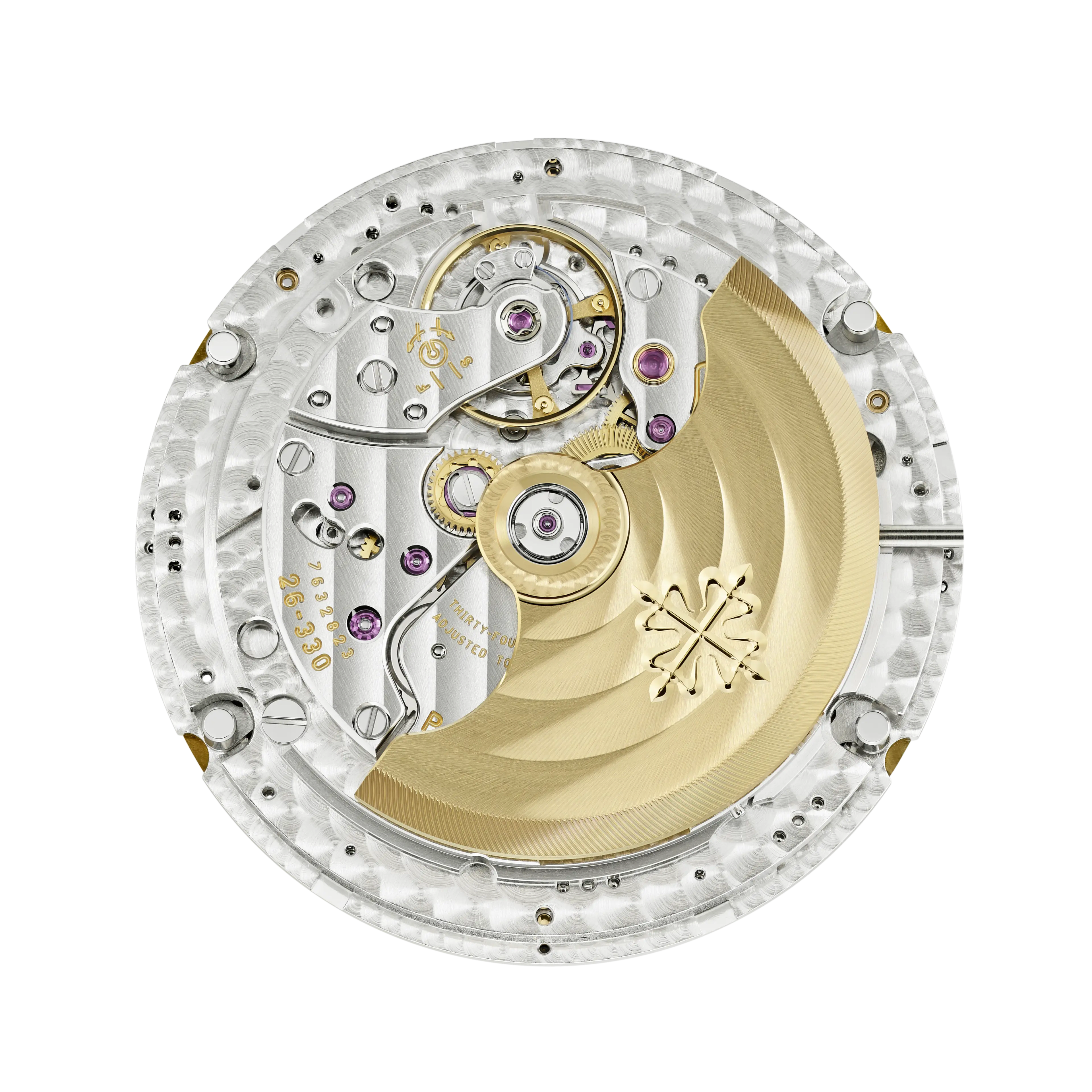 Caractéristiques : Seconde au centre. Diamètre : 27 mm. Épaisseur : 3.32 mm. Nombre de composants : 181. Nombre de rubis : 29. Réserve de marche : min. 45 heures. Masse oscillante : rotor central en or 21 ct. Balancier : Gyromax®. Spiral : Spiromax®. Signe distinctif : Poinçon Patek Philippe.